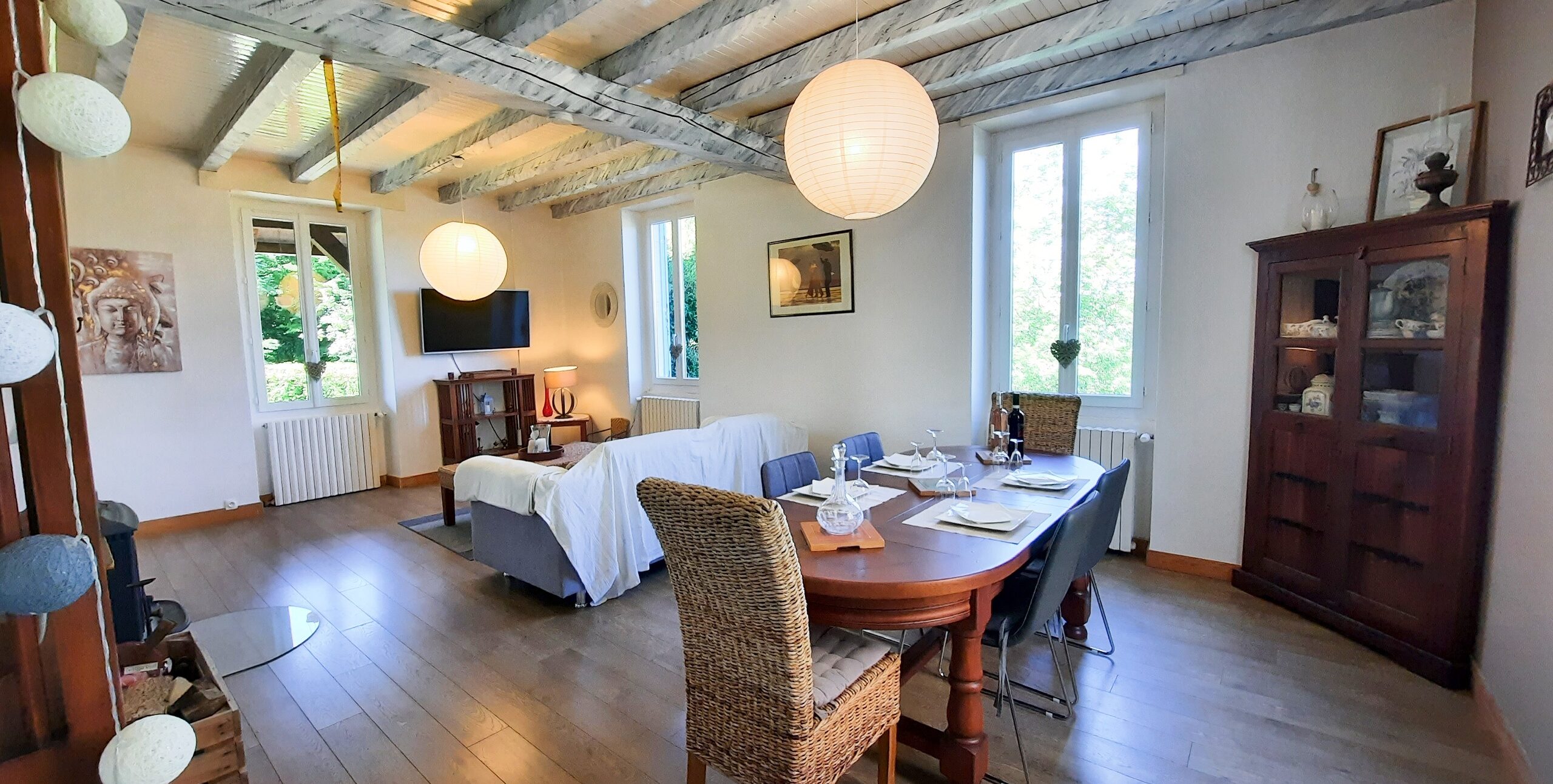 La pièce est très lumineuse, naturellement fraîche en été, les murs de pierre font plus d’un mètre d’épaisseur.